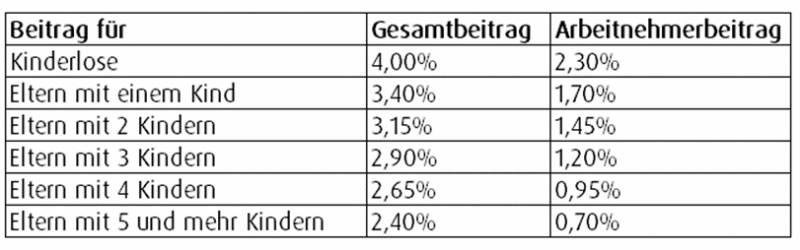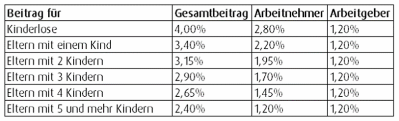 Für Eltern werden gestaffelte Beitragssätze nach Anzahl der Kinder eingeführt. Demnach werden Versicherte mit mehreren Kindern ab dem zweiten und bis zum fünften Kind um 0,25 Beitragssatzpunkte je Kind entlastet. Der Abschlag gilt bis zum Ende des Monats, indem das Kind jeweils sein 25. Lebensjahr vollendet hat. Danach entfällt der Abschlag für diese Kinder.